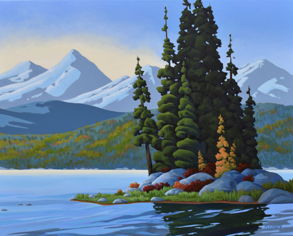 Kristine McGuinty lives and works in Gray Creek, British Columbia. She paints the Selkirk Mountains and Kootenay Lake that she sees everyday outside her window and on hikes getting inspired by the endless beauty this area offers. She is primarily a self taught artist working in acrylic and oils. She sells her paintings and prints from her studio or from the galleries that represent her. Kristine teaches workshops and welcomes visitors to her studio.